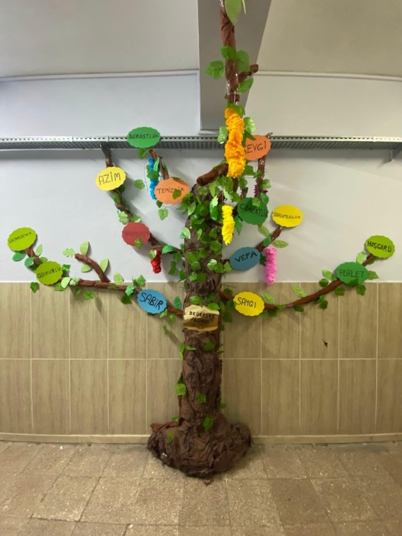 Okulumuzun ‘’Türkiye Yüzyılı Maarif Model’inde Nur Hayati Kurtcan Rüzgarı” yerel projesi kapsamında öğrencilerin değerler hakkındaki farkındalığını artırmak amacıyla rehber öğretmen eşitliğinde öğrencilerimiz tarafından değerler ağacı hazırlanarak okul koridorumuza asıldı.